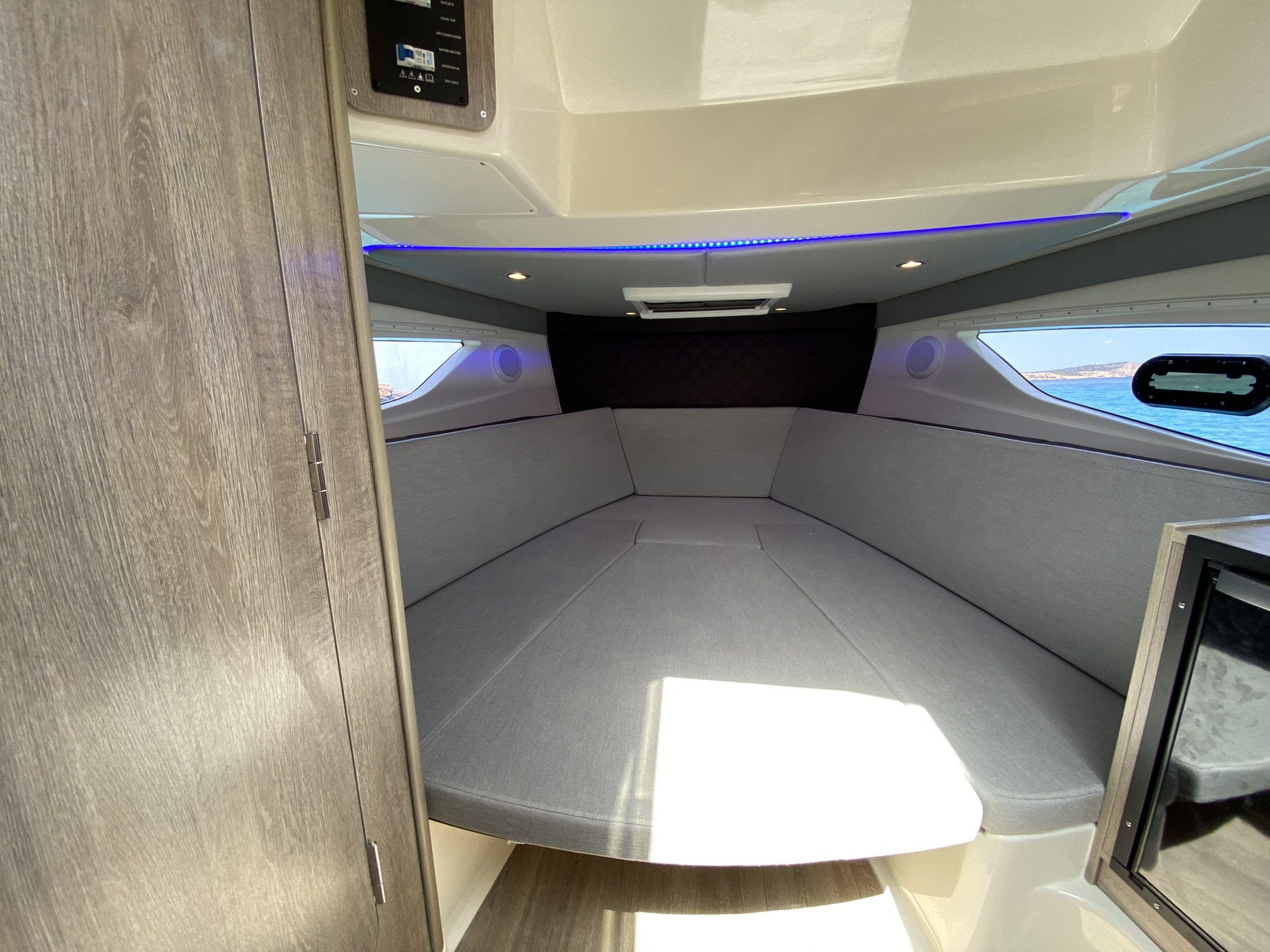 En el interior, el Quicksilver 875 ofrece un cómodo asiento para el conductor y un amplio solárium en proa para relajarse al sol. También cuenta con una mesa en la cabina central que se puede convertir en una cama doble, así como un aseo y una cocina básica para preparar bebidas y aperitivos.