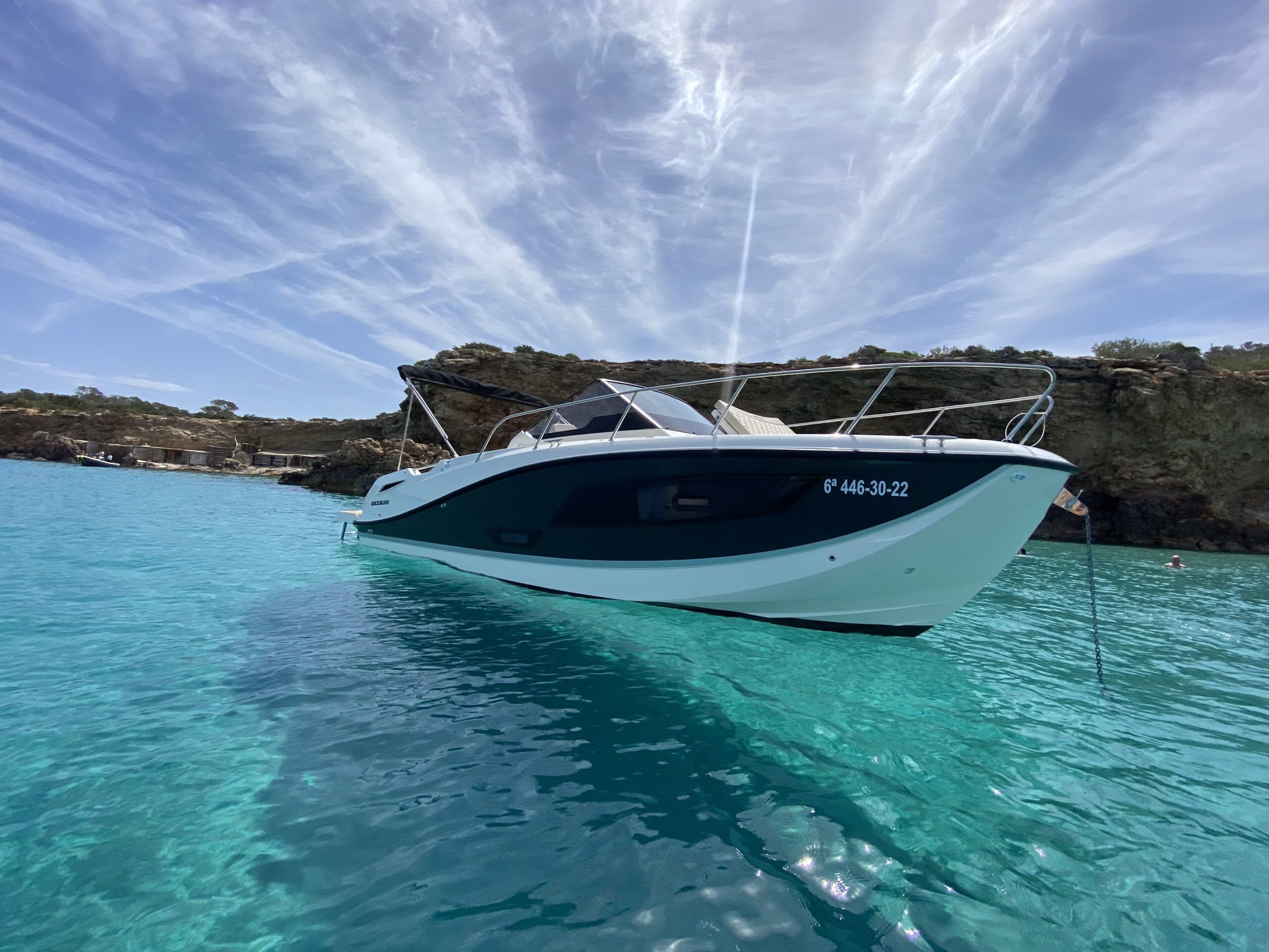 Si estás buscando un barco rápido y deportivo para explorar la costa de Ibiza, el Quicksilver 875 es una excelente opción de alquiler. Con una longitud de 8,80 metros, este barco es lo suficientemente grande para acomodar a un grupo de amigos o familiares, pero también lo suficientemente maniobrable para disfrutar de una navegación ágil y emocionante.